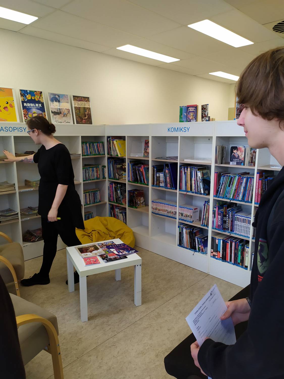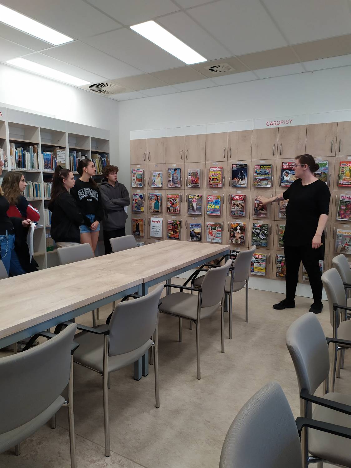 Nejprve zavítali do oddělení pro dospělé. Zde jim paní Hana Minaříková, která nás knihovnou provázela, nabídla možnou registraci na jedem rok zdarma. V této části knihovny studenti zjistili, že kromě výpůjčky knih si zde mohou sami vytvořit na 3D tiskárně modely vlastních návrhů, poslechnout zvukové nosiče nejen čtené, ale i hudební a oblíbenou se stala i místnost plná komiksové literatury.
