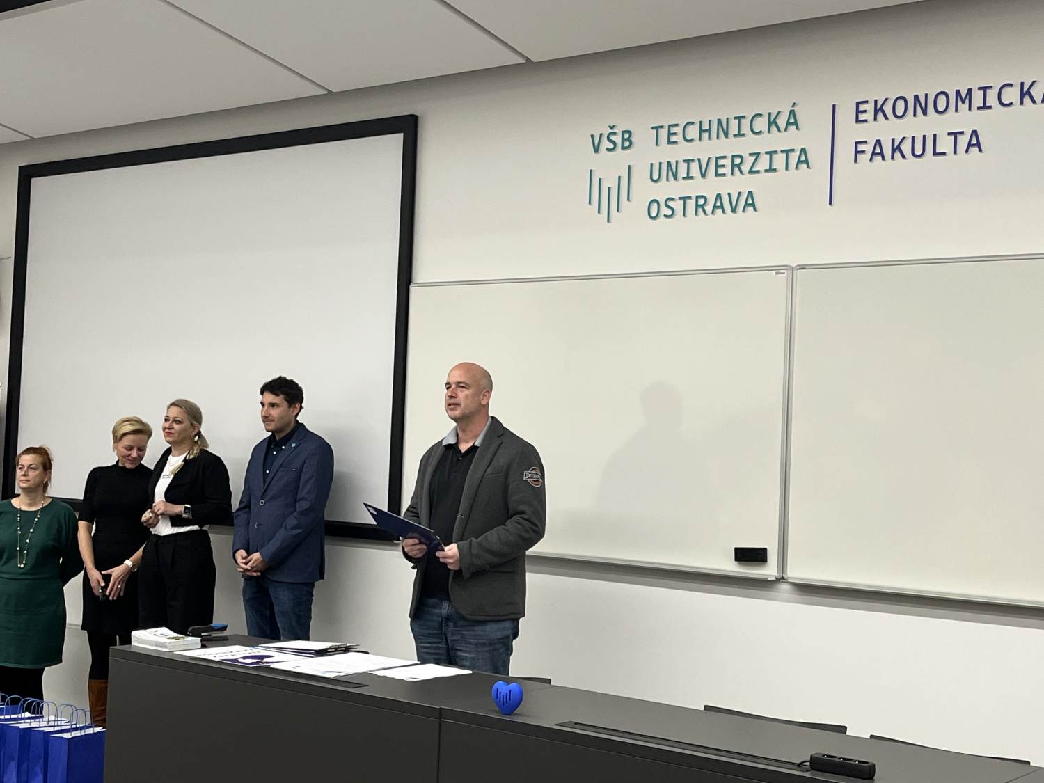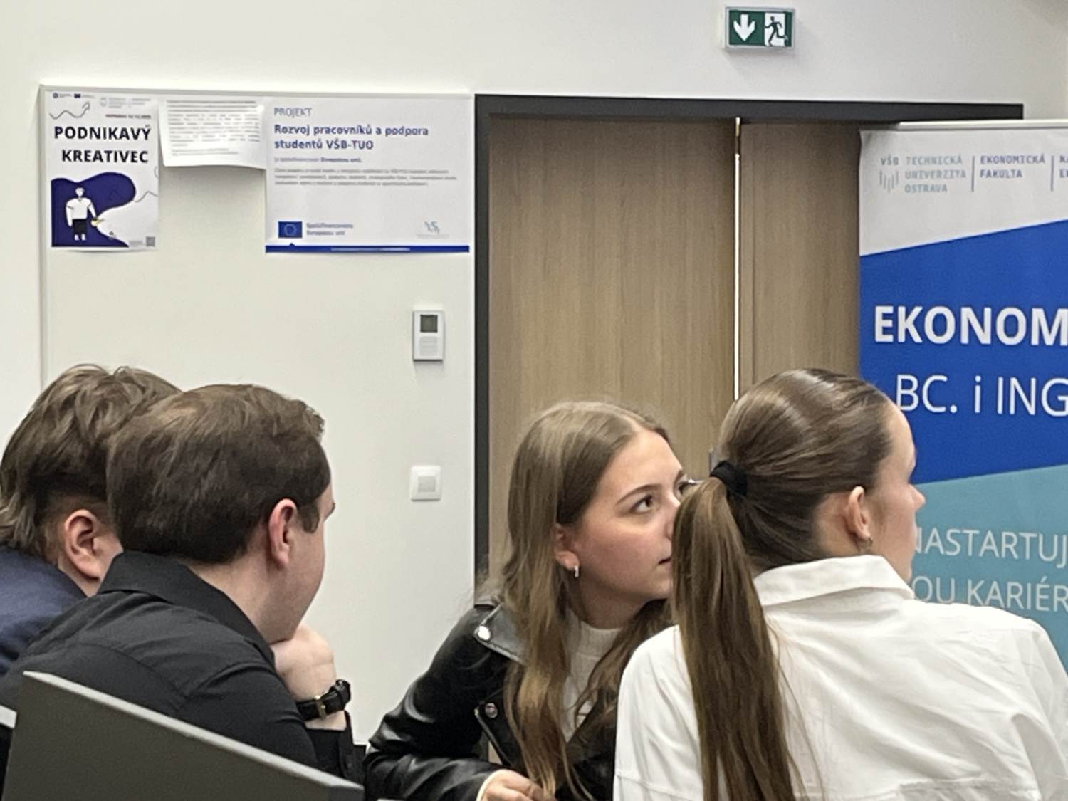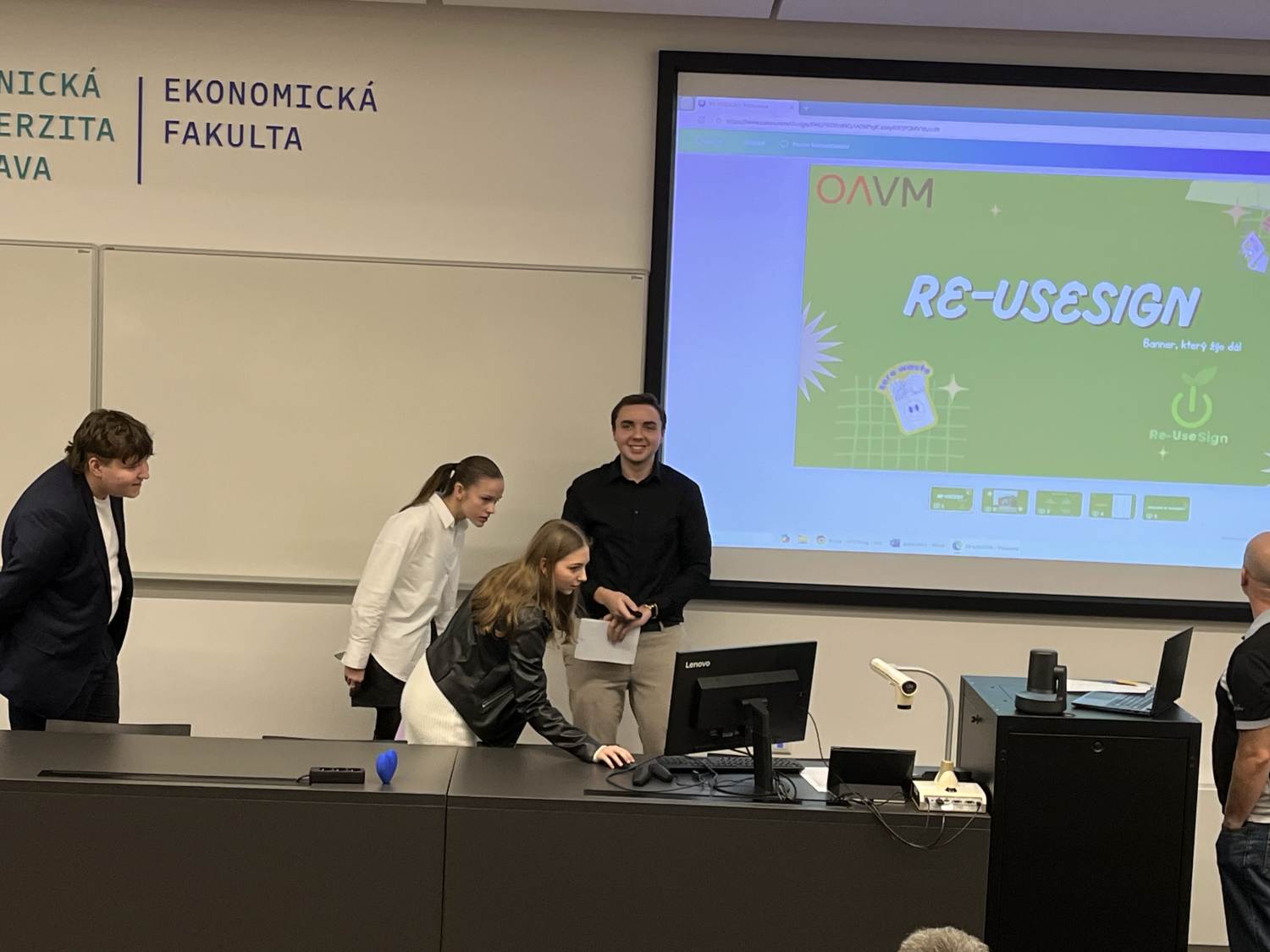 Následně měl každý tým za úkol před všemi účastníky ve stanoveném limitu 3 minuty jasně, strukturovaně a atraktivně svůj podnikatelský plán prezentovat, obhájit a odpovědět na dotazy čtyř vyučujících z katedry podnikové ekonomiky, ekonomie, financí a marketingu. Naši žáci velmi zdařile prezentovali svůj záměr poskytování služeb pro obchodní řetězce se zaměřením na minimalizaci papírových letáků.