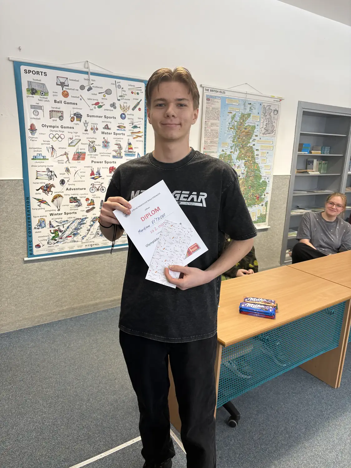 Student naší školy Martin Vítek ze třídy 3.A dosáhl významného úspěchu v okresním kole olympiády v anglickém jazyce, kde se umístil na 2. místě. Díky tomuto výsledku se stal jedním ze dvou soutěžících, kteří postupují do krajského kola soutěže.