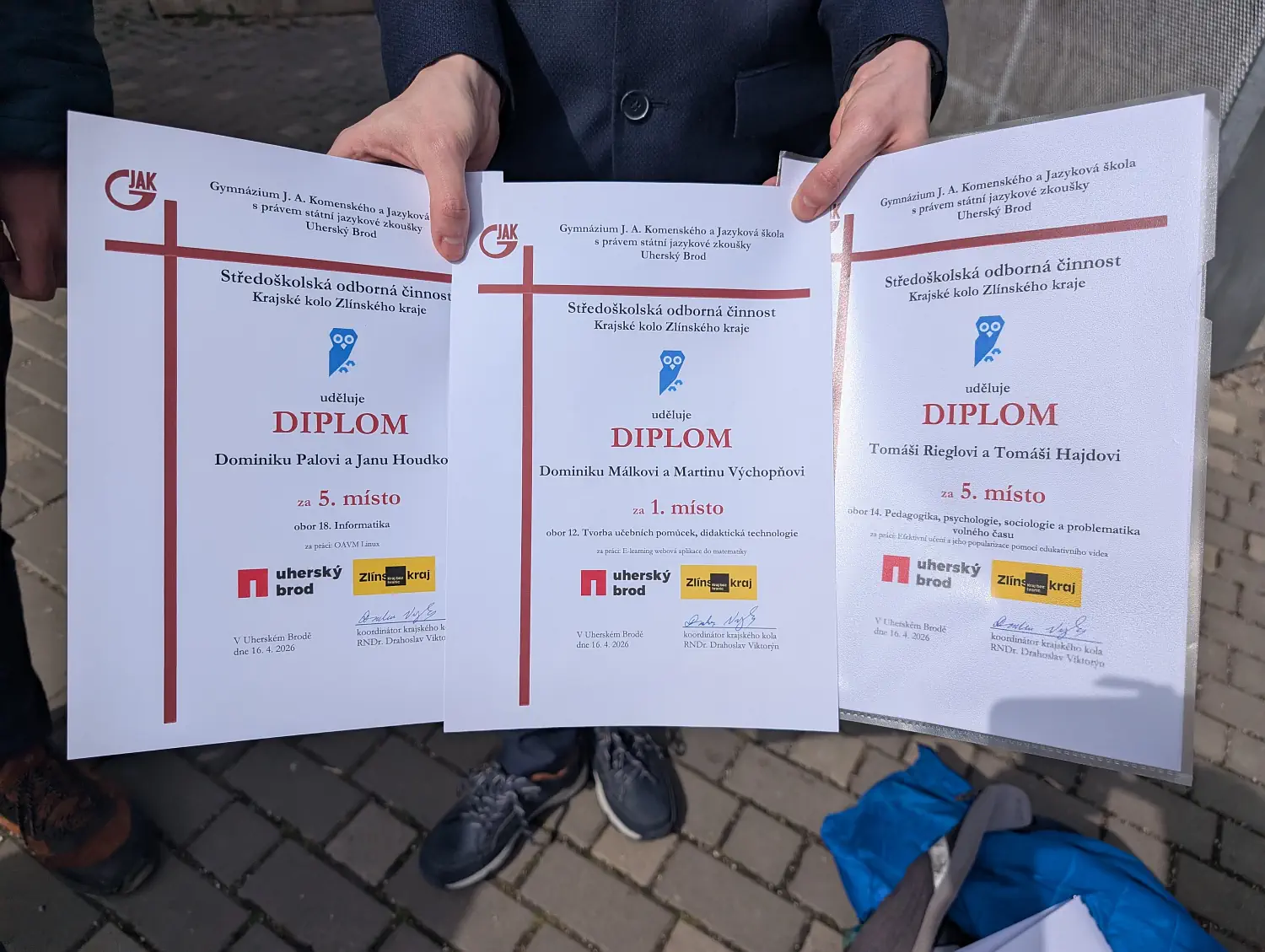 Dne 16. dubna 2026 se naši žáci zúčastnili krajského kola SOČ, které proběhlo na Gymnáziu J. A. Komenského a Jazykové škole s právem státní jazykové zkoušky v Uherském Brodě. Naši školu reprezentovalo 6 žáků se 3 soutěžními pracemi ve třech soutěžních oborech, kde obstáli ve velké konkurenci ostatních účastníků.